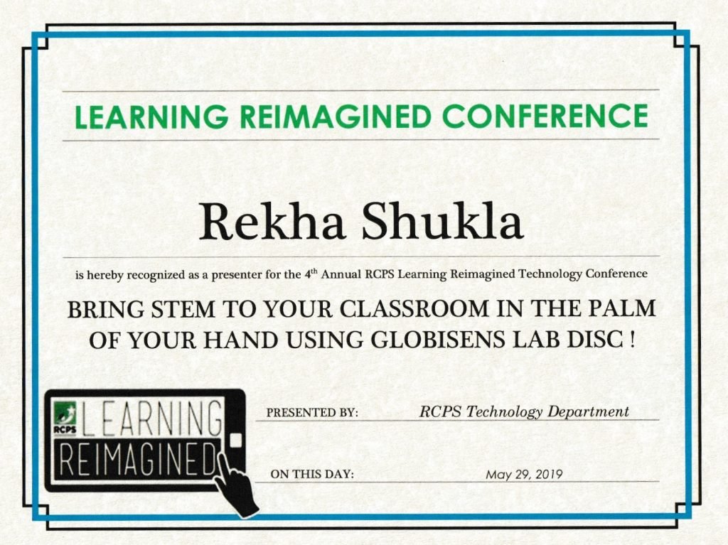 Dr Shukla presented on use of GLOBISENS Lab DISC in Science teaching in Learning Re-imagined conference organized by RCPS at Heritage High School.